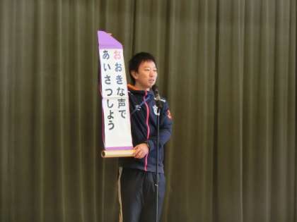 看護当番の先生からは、生活目標「おおきな声であいさつしましょう。」の発表がありました。