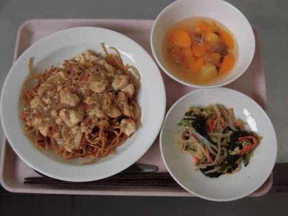 麻婆やきそば 牛乳 わかめサラダ フルーツみつ豆