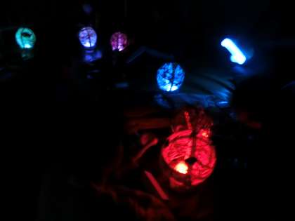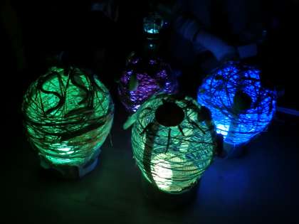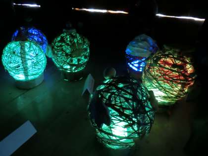 5年2組は作品が完成したので、体育館の舞台を暗くして、鑑賞会を行いました。