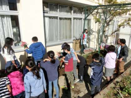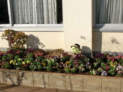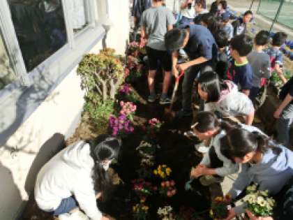 今日は、栽培委員会は地域の方と一緒に花の苗を植えました。