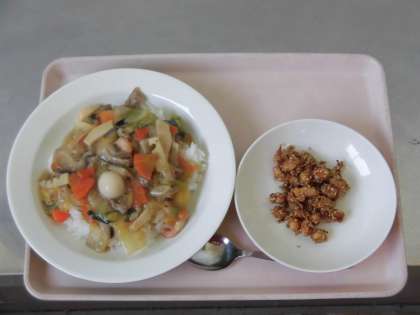 中華丼 牛乳 大豆とじゃこの甘辛あえ