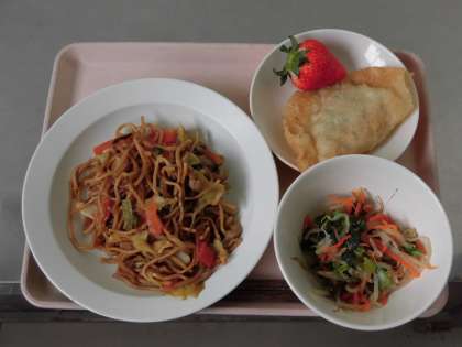 ソース焼きそば 牛乳 ジャンボぎょうざ 塩ナムル くだもの