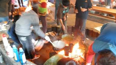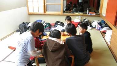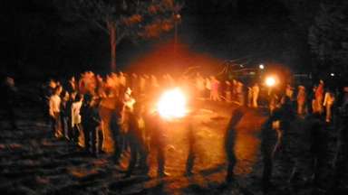夕食は、自分たちで作るカレーライスです。班で役割を分担し、手際良く進めていきます。かまどの煙に苦労しながら、できあがったカレーライスの味は格別です。また、まきの火は暖をとるのにも役立ちました。夕食後は、キャンプファイヤーです。寒い夜でしたが、火を囲んで体をたくさん動かすダンスのおかげで、ほかほかです。