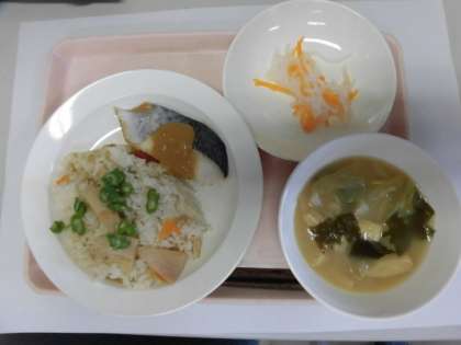 たけのこごはん 魚の西京焼き だいこんの甘辛漬 春キャベツのみそ汁 牛乳