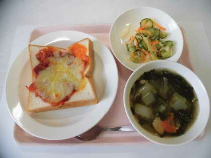 ピザトースト 田舎風スープ 野菜のイタリアンドレッシングかけ 牛乳