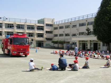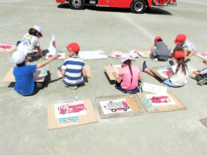 良く晴れた青空の下で、子どもたちは一生懸命に消防車を描いていました。