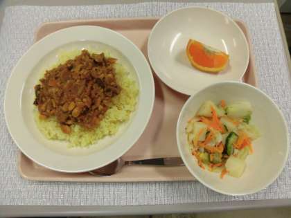 大豆入りドライカレー ポテト入りフレンチサラダ くだもの 牛乳