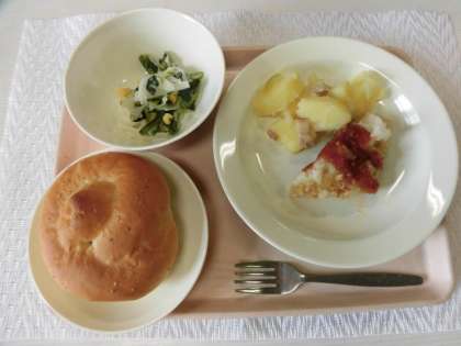 セサミパン 魚のバーベキューソース ジャーマンポテト ほうれん草とキャベツのサラダ 牛乳
