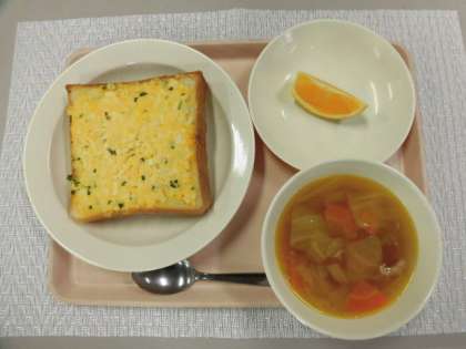たまごトースト 白いんげんの田舎風スープ くだもの 牛乳