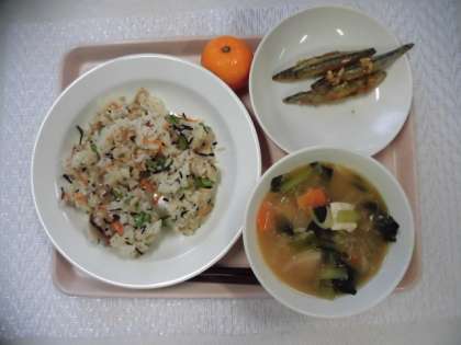 五目ごはん きびなごの南蛮漬け みそ汁 くだもの 牛乳