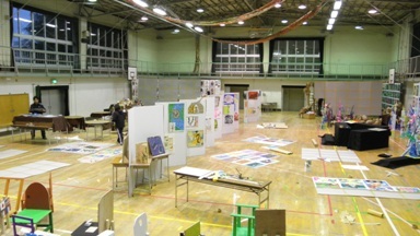 学習発表会に向けて、着々と準備を進めています。子どもたちの作品は教員が、中学生や地域・保護者の皆さんの作品は、PTAの皆さんにも協力をいただいて展示準備をしています。子どもたちが下校した後、静まりかえった体育館で手をこすり合わせながら作業を進めています。