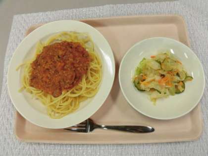 スパゲッティミートソース 野菜のイタリアンドレッシングかけ 牛乳