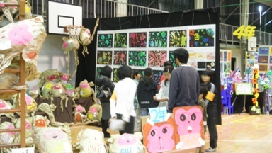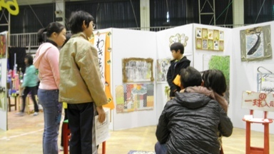 午前9時から12時まで、体育館でご来場の皆様に6年生による子ども学芸員が各学年の作品の見どころなどを紹介させていただいております。ふだんは恥かしがり屋の子も、精一杯紹介させていただいています。どうぞ、ご利用ください。