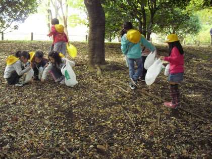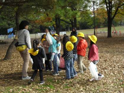 公園に着くと、早速、きれいに紅葉した桜やいちょうなどの葉っぱ、