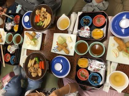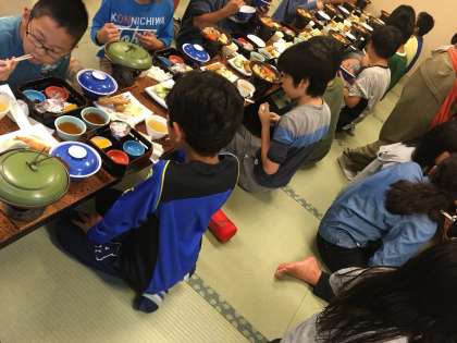 お座敷に配膳された夕食を前に、さらに元気が沸く6年生。ご飯お代わりの挙手がやみません。キャンプファイヤーに備えてしっかりいただきました。