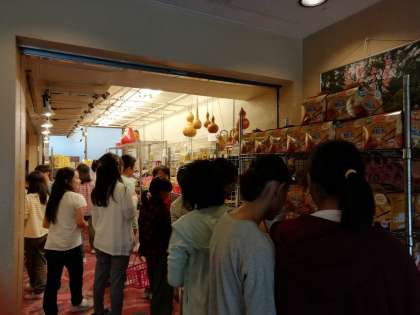 お風呂の順番を待つ間、お土産を選びました。餃子味やいちご味のポテトチップス、レモン牛乳味のキャラメル、お土産選びも大はしゃぎです。