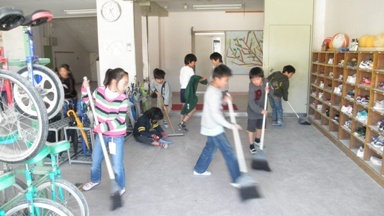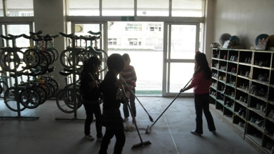 本校の校庭の土の粒子は小さく軽いため、昇降口は休み時間が終わるたびに乾いた土だらけになってしまいます。C昇降口も同じです。掃除の時間にのぞくと、3年生が協力して掃除をしてきれいにしていました。掃除をしても毎日汚れてしまう昇降口ですが、掃除をし終えた後だけは、とてもきれいです。