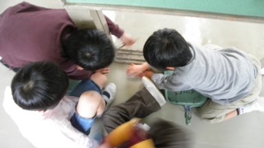 掃除の時間に校舎内を歩くと、いろいろな発見があります。今日は1年生の教室前の廊下で足が止まりました。4人で一生懸命隅に入り込んだごみを協力しながら取り除いているのです。こんな光景を目の当たりにすると、うれしくなります。