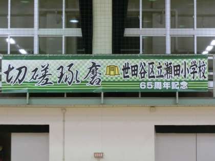 体育館に「65周年の横断幕」が飾られました。そこで、校長先生から「切磋琢磨」のお話がありました。