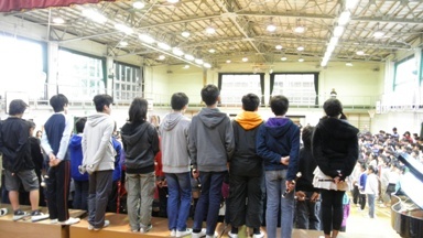 16日(木)の音楽朝会では、全員合唱をした後に6年生全員が5年生以下に名曲「カノン」と「剣の舞」を披露しました。難しい曲にもかかわらず、見事な演奏をした6年生を下級生が羨望の眼差しでみていました。