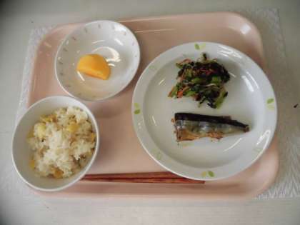 栗ごはん 牛乳 さんまの筒煮 小松菜の乾物和え 柿
