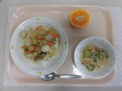 中華丼 牛乳 春雨サラダ くだもの(柑橘:はやか)
