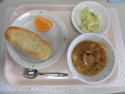ソフトフランスパン 牛乳 ポークときのこのシチュー キャベツサラダ くだもの(夢オレンジ)