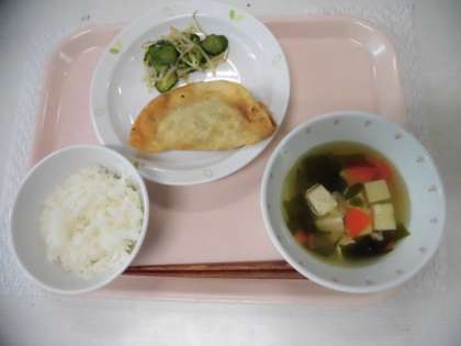 ごはん 牛乳 ジャンボぎょうざ わかめスープ 野菜の中華味
