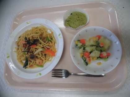 和風スパゲッティ 牛乳 マセドアンサラダ おから入りあしたばマフィン