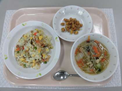 チャーハン 牛乳 ビーフンスープ 大豆とじゃこの甘辛揚げ