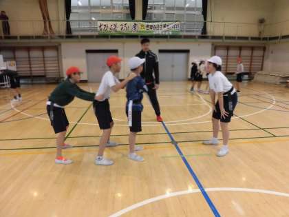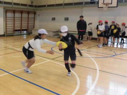 タグを取る遊びやラグビーボールの投げ方、一対一での実践を行いました。
