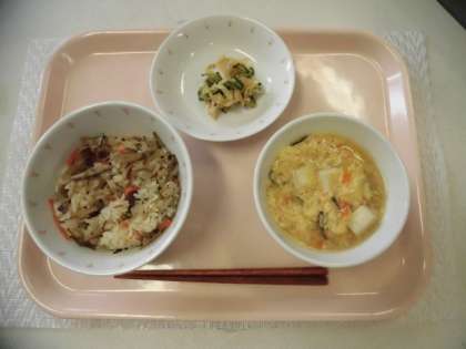 豚肉とごぼうのごはん 牛乳 かみなり汁 切干大根ときゅうりのごま酢あえ