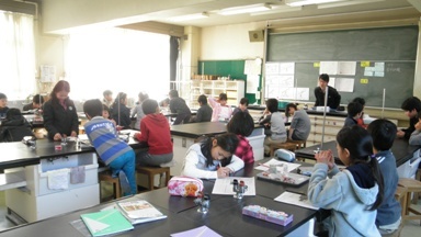 4年2組の理科の授業の様子です。金属の熱の伝わり方について、安全に気を付けながらアルコールランプを使って調べていました。この学習では、金属、水及び空気の性質について実験を通して調べていきます。4年生のときに、安全で正しい器具の使い方や実験の心構えをしっかりと学んでいきます。この力が、危険な薬品も扱うようになる5・6年の理科の学習に生きてきます。