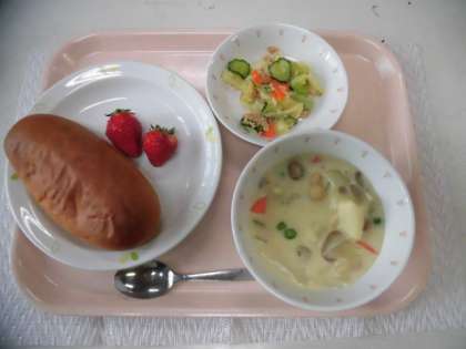 黒砂糖パン 牛乳 クリームシチュー ツナサラダ くだもの(いちご)