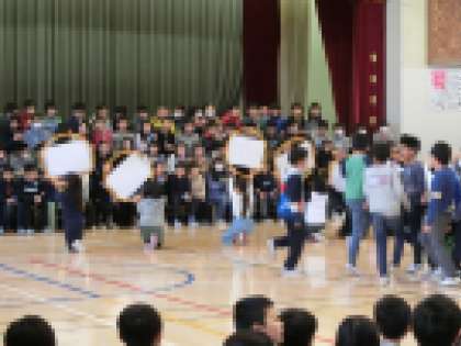踊りや群読、歌や集団行動など、どの学年も工夫を凝らし、6年生へのお祝いの気持ちを表しました。
