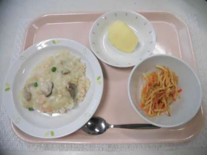 シーフードクリームライス 牛乳 じゃがいものハニーサラダ くだもの(りんご)