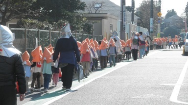 近くのこひつじ幼稚園の皆さんが、大地震が発生し、より安全な第二次避難場所である本校に避難をする訓練のため、年少さんから年長さんまで全員防災ずきんをかぶりやってきました。大変お行儀がよく先生の指示にしたがって行動していました。年長さんの皆さんとは、今度1年生が交流をします。今から楽しみです。