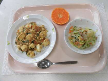 麻婆豆腐丼 牛乳 春雨サラダ くだもの(はまさきみかん)