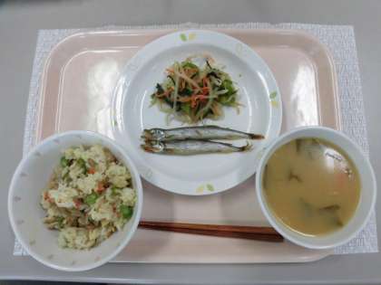 とりめし 牛乳 焼きししゃも みそ汁 野菜のからしじょうゆかけ