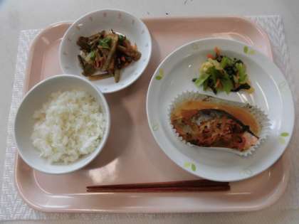 ごはん 牛乳 鮭のチャンチャン焼き くきわかめのきんぴら 野菜のおかかかけ