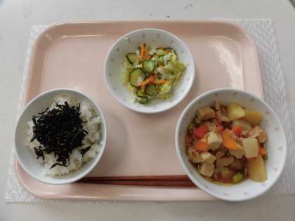 麦ごはん 牛乳 ひじきのふりかけ 肉じゃがうま煮 野菜の甘酢あえ