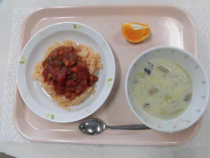 アロス・デ・ポルヴォ(たことトマトのごはん) 牛乳 カルドベルデ(キャベツのポタージュ) くだもの(デコポン)