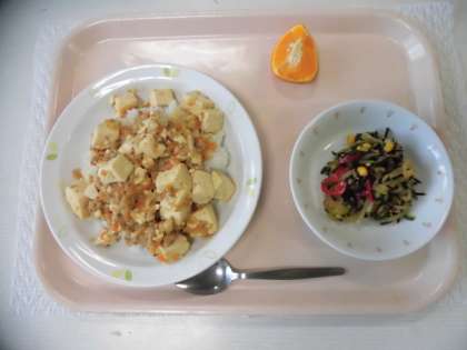 麻婆豆腐丼 牛乳 大根とひじきのサラダ くだもの(セミノールオレンジ)