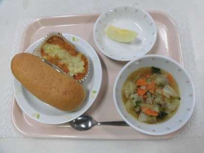 セサミパン 牛乳 コテージパイ(マッシュポテトとひき肉のグラタン) スコッチブロス(大麦とレンズ豆のスープ) くだもの(りんご)