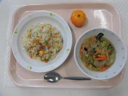 えびチャーハン 牛乳 ビーフンスープ くだもの(冷凍みかん)