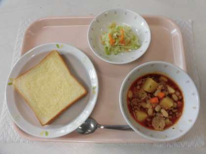 ガーリックトースト 牛乳 ポークビーンズ キャベツサラダ
