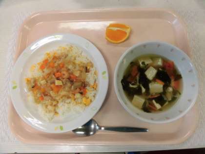 あんかけチャーハン 牛乳 わかめスープ くだもの(バレンシアオレンジ)