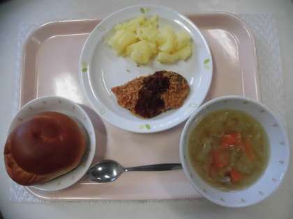 黒砂糖パン 牛乳 魚のフライ 粉ふきいも 野菜スープ