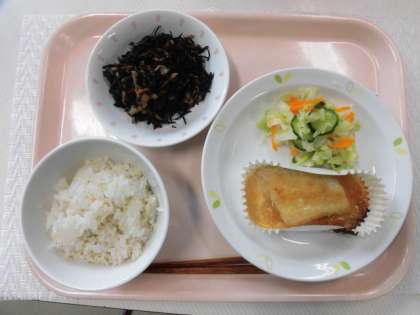 麦ごはん 牛乳 魚のみそマヨネーズ焼き ひじきの煮つけ 野菜の甘酢和え