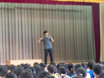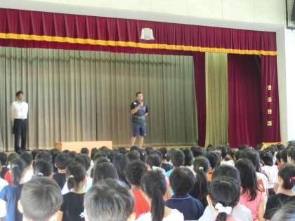 今日から始まるプールが始まります。そこで全校朝会では、水の楽しさと怖さについて、校長講話がありました。
